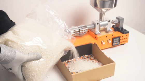 推奨比率は新品のプラスチックが60%、粉砕してペレット状にしたごみが40%。