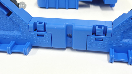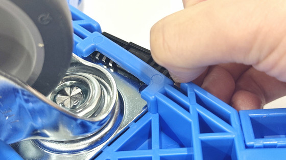さらに、OCドーリー 50Lオリコン用コンテナ台車はキャスターを取り外すことも可能。キャスターの留め具となっている黒いパーツが青いフレームに刺さっているので、これを外せばOK。