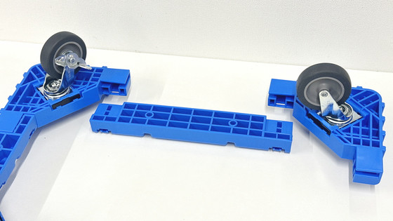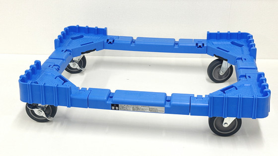 4つのコーナーパーツを連結バーで接続したら完成。ものの数分で組み立ては完了します。キャスターパーツ以外はすべて樹脂製で非常に軽く、OCドーリー 50Lオリコン用コンテナ台車の重量は約2.3kgですが、耐荷重は100kgとなっています。