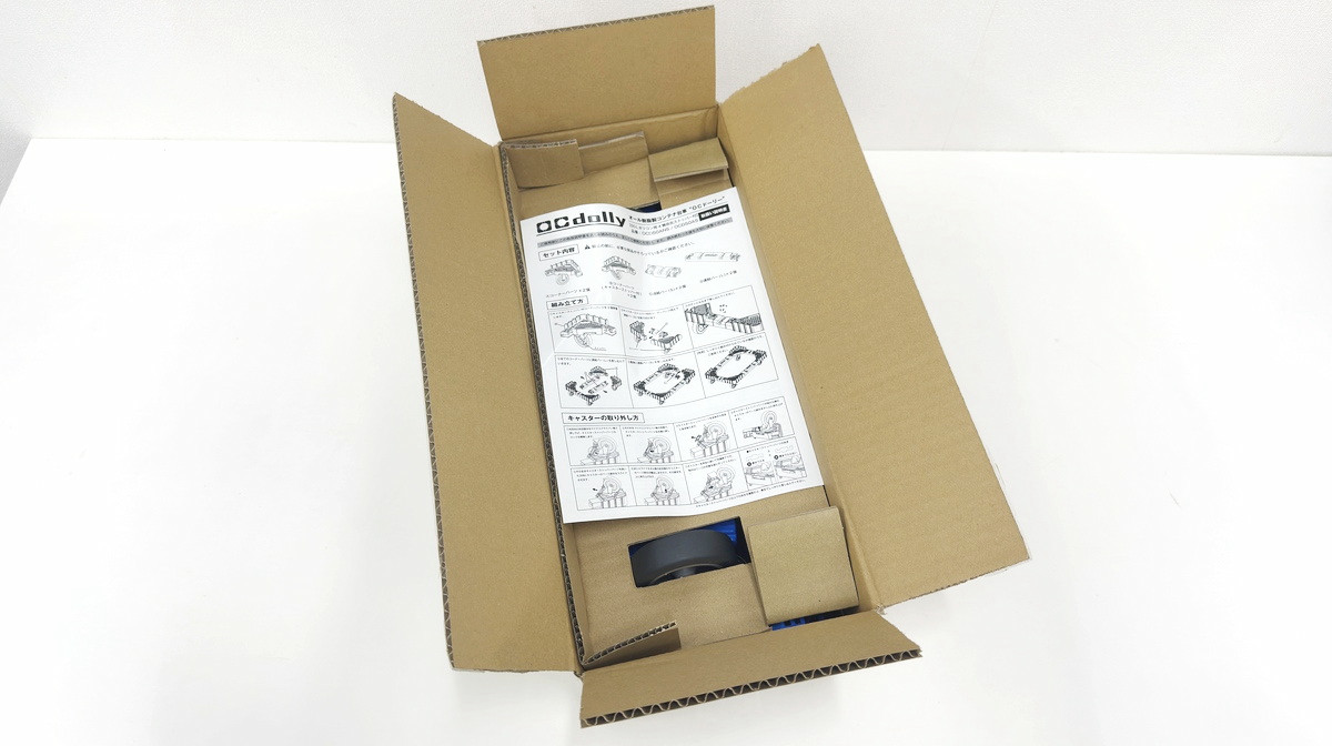内容物は取扱説明書とコーナーパーツが4つ、連結バー(S)が2本、連結バー(L)が2本。コーナーパーツには車輪がついていて、4つのうち2つには車輪にキャスターストッパーがついています。