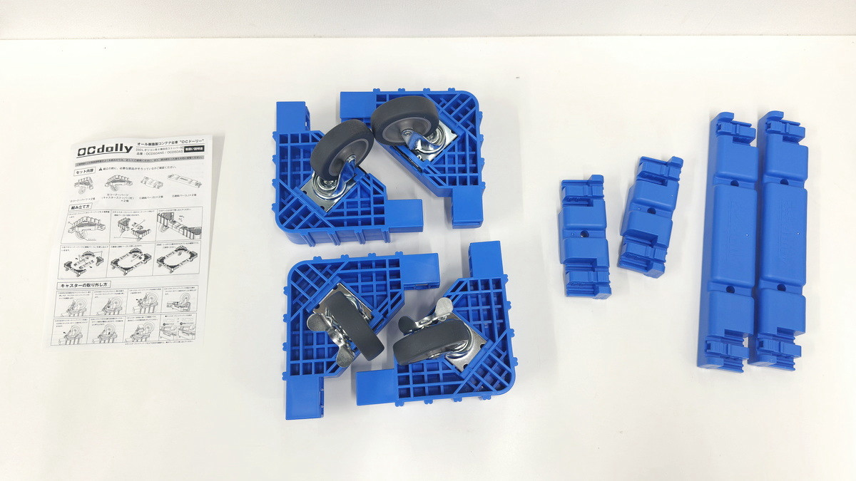 4つのコーナーパーツを連結バーで接続したら完成。ものの数分で組み立ては完了します。キャスターパーツ以外はすべて樹脂製で非常に軽く、OCドーリー 50Lオリコン用コンテナ台車の重量は約2.3kgですが、耐荷重は100kgとなっています。