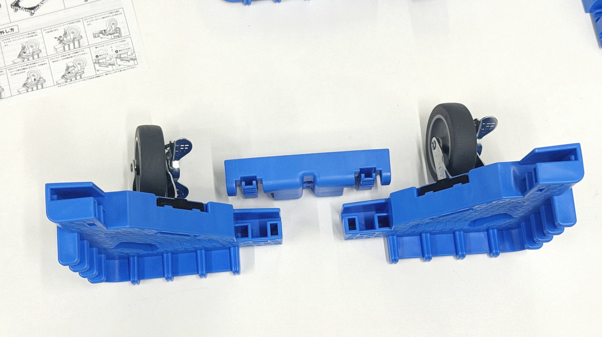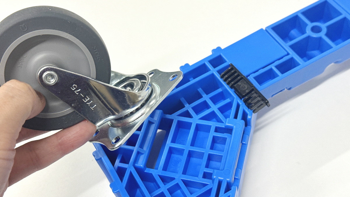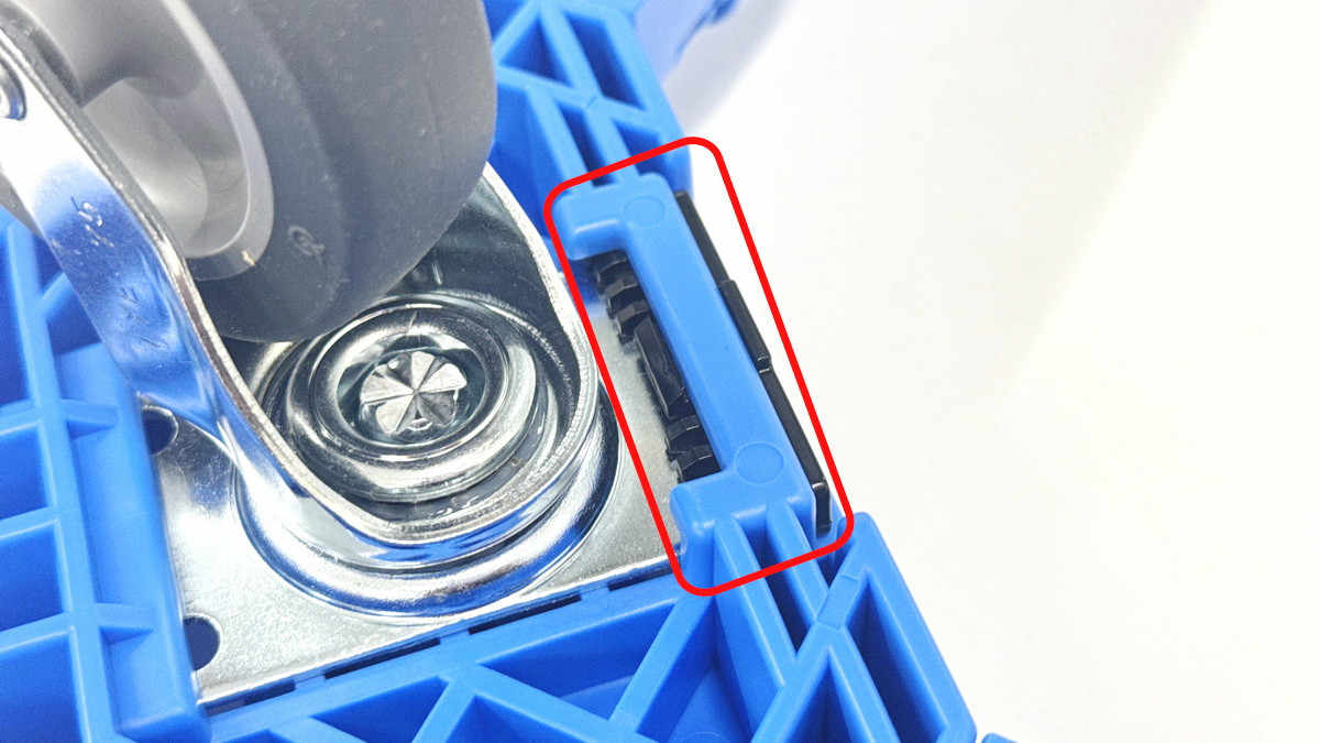 さらに、OCドーリー 50Lオリコン用コンテナ台車はキャスターを取り外すことも可能。キャスターの留め具となっている黒いパーツが青いフレームに刺さっているので、これを外せばOK。