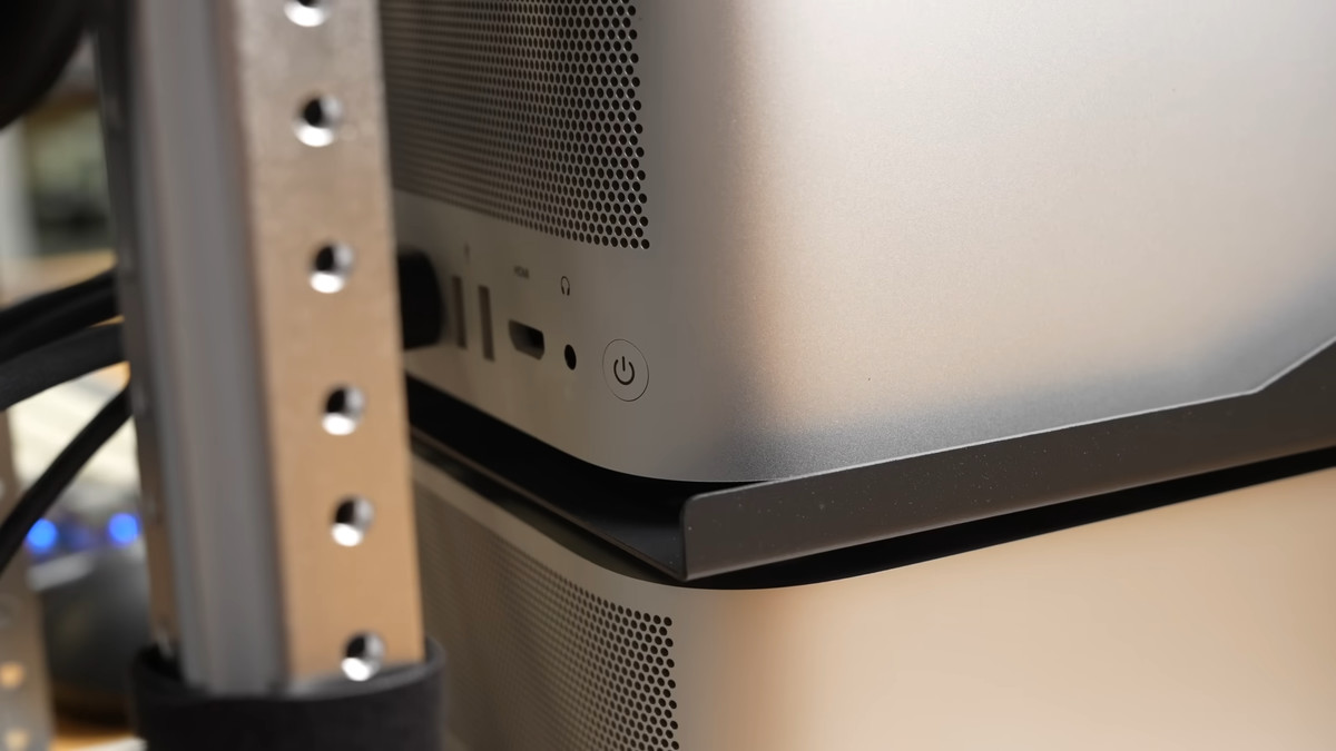 ここで最も厄介な問題となるのが電源ボタンの配置。Mac Studioの電源ボタンは背面向かって右側、丸みを帯びた角に位置しているため、ラックに収めるとボタンの操作が極めて難しくなります。ギアリング氏が以前使用していたデスク用ラックマウントでは前面からボタンを押すための複雑なアーム機構が必要でしたが、今回のミニラックは側面が開放されているため、横から手を入れてボタンを押すことができます。