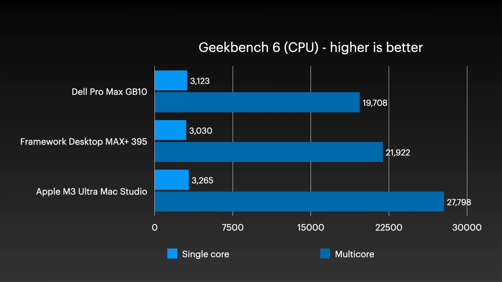 まずはGeekbench 6でのシングルコア(水色)とマルチコア(紺色)の比較は以下の通り。2世代前のCPUコアを搭載しているM3 Ultra Mac Studioが、Dell Pro Max with GB10やFramework Desktopを上回る結果となりました。
