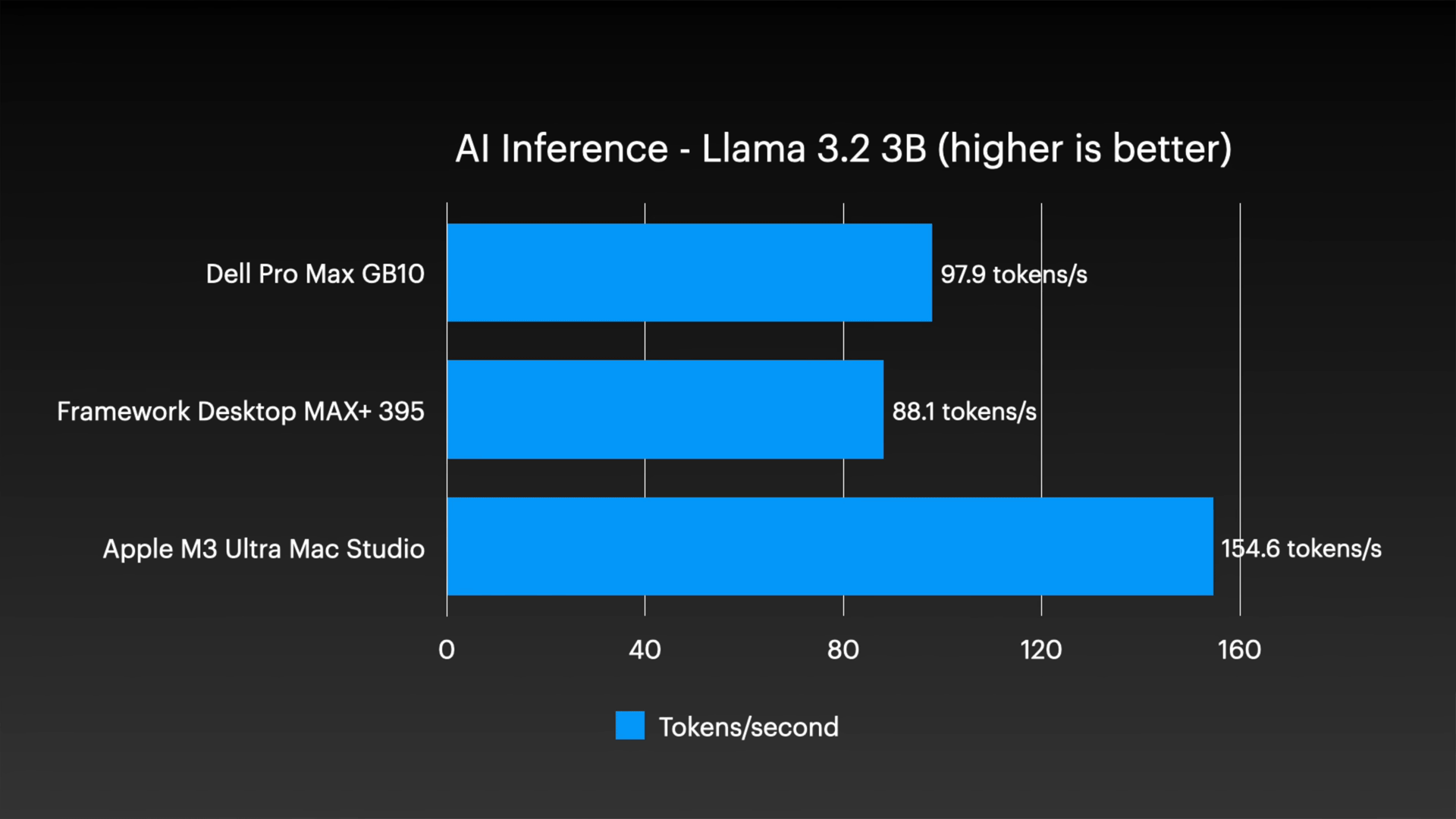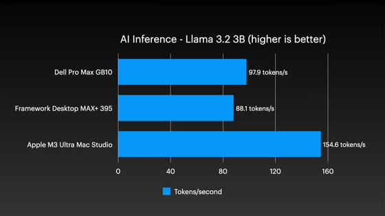 AI推論テストにおいては、単体でもMac Studioの優位性が顕著です。Llama 3.2 3Bを用いたテストでは、Mac Studioが毎秒154.6トークンを記録したのに対し、Dellは毎秒97.9トークン、Frameworkは毎秒88.1トークンに留まりました。
