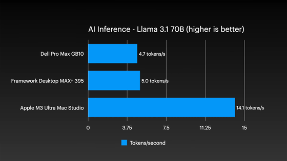 さらに大規模なLlama 3.1 70Bでは、Mac Studioが毎秒14.1トークンを維持した一方で、他2つのシステムは毎秒約5トークン以下へと大幅に低下しました。