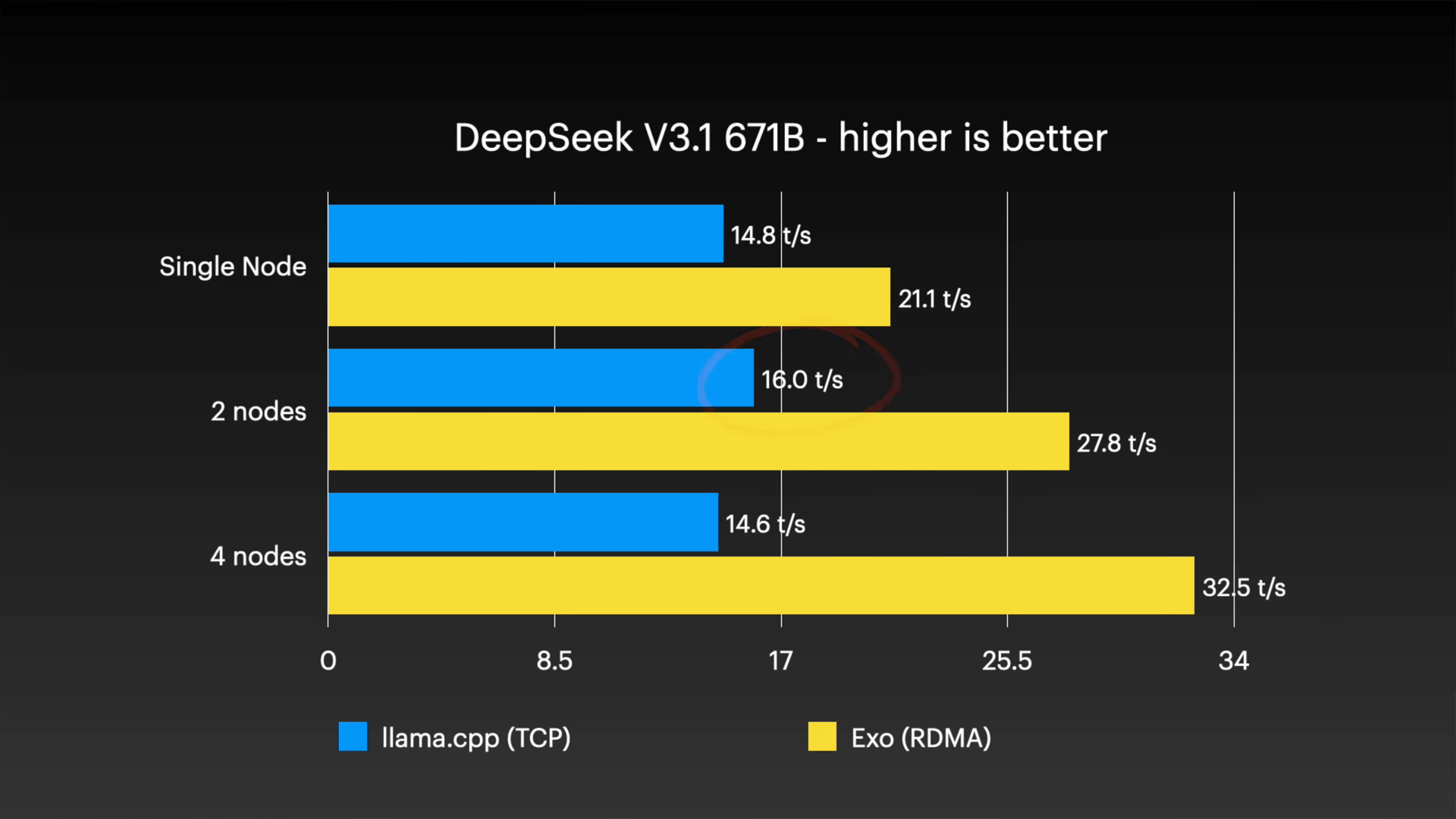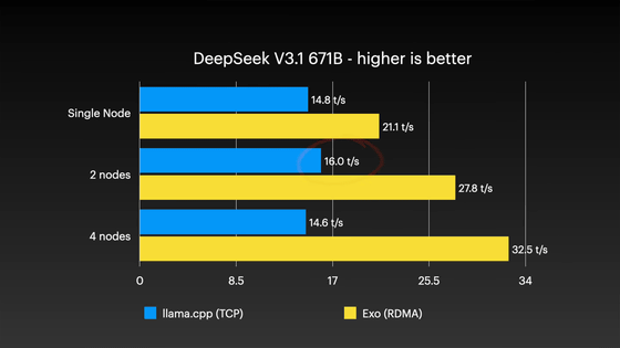 さらに6710億パラメータという巨大なモデルであるDeepSeek V3.1においても同様の傾向が確認されており、exo環境では4ノード構成で毎秒32.5トークンに達し、llama.cpp(TCP)の毎秒14.6トークンに対して2倍以上の性能差をつけています。