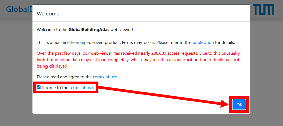 3Dマップにアクセスすると「アクセスが集中しているため、データの読み込みが失敗する可能性がある」という注意書きが表示されました。利用規約をよく読んでから同意のチェックを入れて「OK」をクリック。