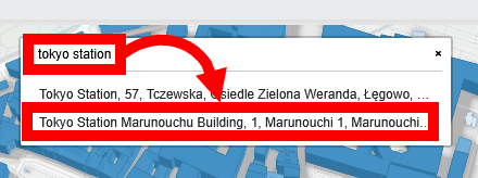 東京駅周辺の3Dマップを確認したいので、上部の検索欄に「tokyo station」と入力して丸の内ビルディングをクリック。