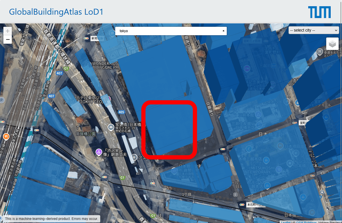 GlobalBuildingAtlasで提供される3Dデータの97%は「LOD1」と呼ばれる粗めのデータです。赤枠で囲った部分には「円」の形をしていることで有名な日本銀行本店があるのですが、「円」の形にはなっていませんでした。