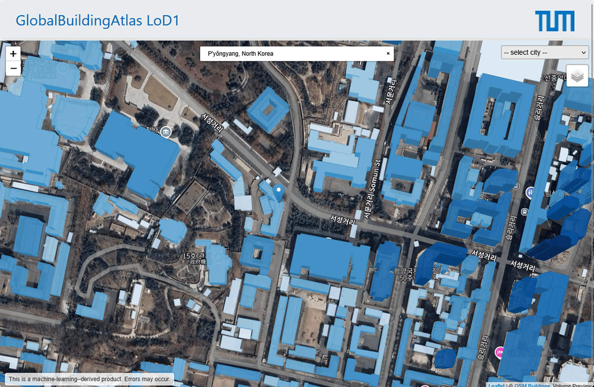 GlobalBuildingAtlasには2019年以降の衛星データから生成された27億5000万軒の建物が含まれており、従来のデータでは無視されがちな地域の建物も含まれているのが特徴です。試しに北朝鮮の平壌を確認してみたところ、3Dデータがしっかり含まれていました。