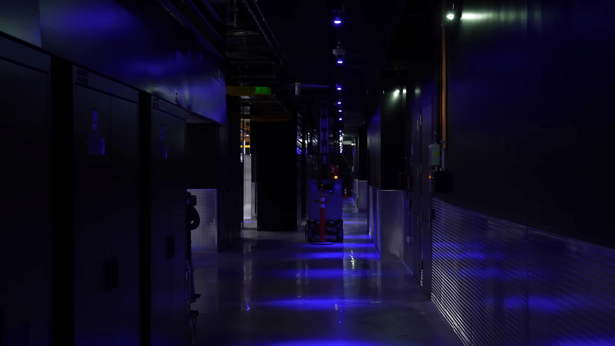 ただ、サーバーが置かれたエリアをのぞいてみても、どの企業が使っているものなのかを示す兆候は1つもなかったそうです。さらに機器に付けられたラベルを遠くから読み取りにくくするため、現場は青いライトで照らされている模様。希望する顧客は完全に外部から見えないように機器を保管できるとのことです。