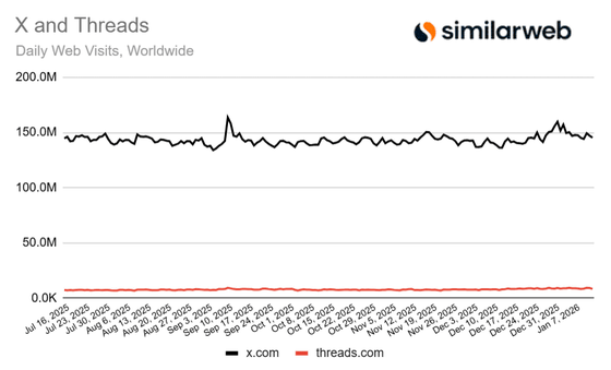 ただし、ブラウザ版のデイリーアクティブユーザー数ではXが圧倒していることも明らかになっています。以下は2025年7月以降のブラウザ版X(黒線)とThreads(赤線)のデイリーアクティブユーザー数をまとめたグラフ。Xのデイリーアクティブユーザー数が1億5000万人前後であるのに対して、Threadsはわずか850万人程度となっており、モバイルアプリと比較するとブラウザ経由ではほとんど使われていないことがわかります。