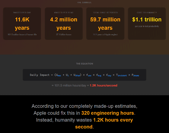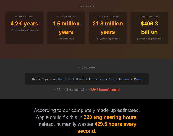 さらにスクロールするとメール検索の問題によって「1日当たり4200年分のユーザー時間が無駄になっている」「これまでに人類の4063億ドル(約63兆2600億円)が無駄になった」「Appleは320時間で問題を修正できるはずなのに、人類の時間が毎秒429.5時間も無駄になっている」といった数値が表示されました。