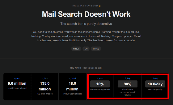 Bugs Apple Lovesにラインナップされている問題は実在するものですが、各数値はBugs Apple Lovesが大まかに導き出したものです。各問題の赤枠で囲んだ部分の値はユーザーが自由に調整可能で、入力した値に合わせて時間などが再計算されます。メール検索問題の場合は「Apple製品ユーザーの何%がAppleのメールアプリを使っているか」「メールアプリのユーザーのうち、何%が検索問題に直面しているか」「検索機能を1日何回使うか」という値を調整可能でした。試しに「Apple製品ユーザーの10%がAppleのメールアプリを使い、90%が問題に直面し、メール検索回数は1日10回」という設定にしてみました。