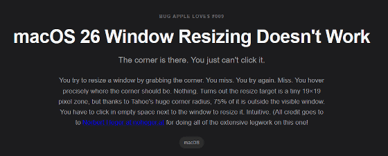 Bugs Apple Lovesには他の問題もラインナップされています。例えば、macOS 26(macOS Tahoe)で発生している「ウィンドウサイズの変更が難しい」という問題もありました。