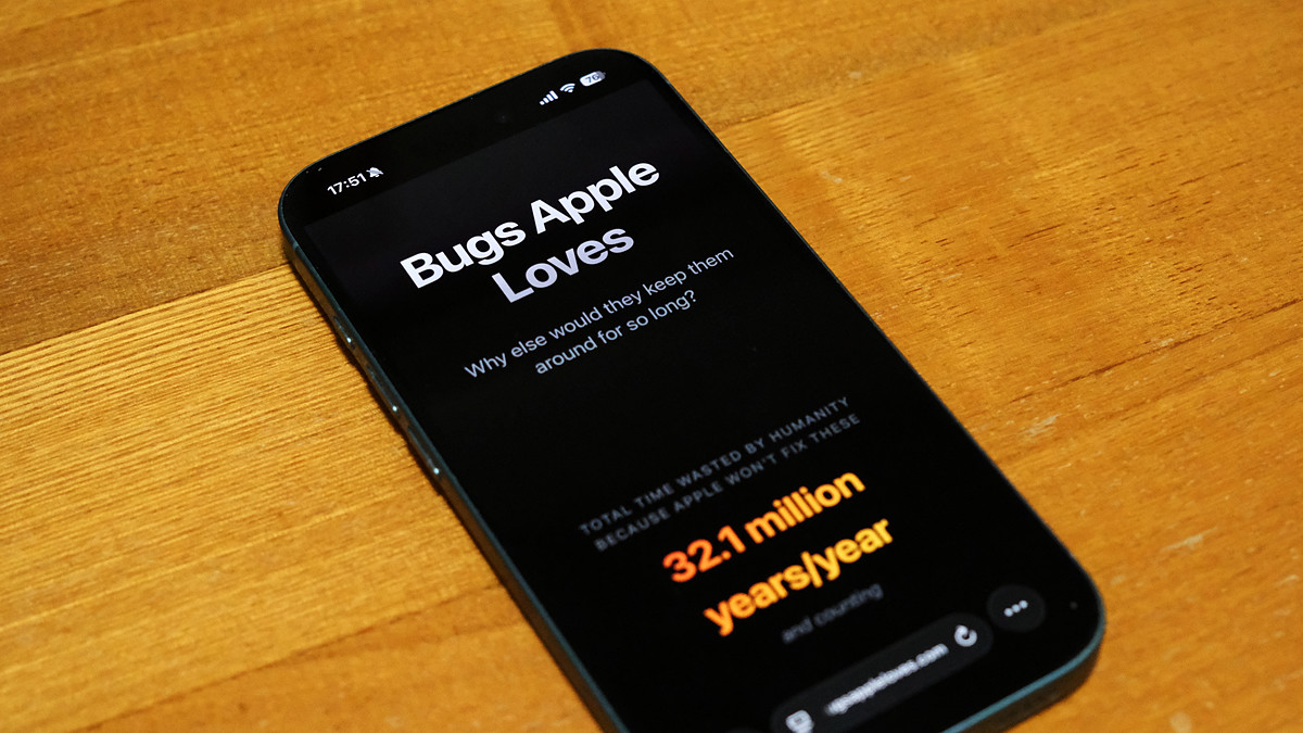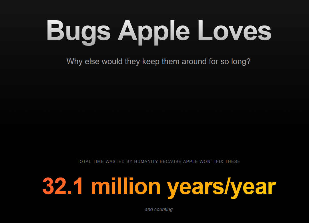 Bugs Apple Lovesにアクセスすると「なぜAppleはこんなに長く放置するのか?」という文面とともに目立つ色で「1年当たり3210万年分のユーザーの時間が無駄になっている」という大げさな数値が記されています。