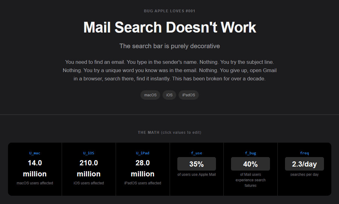 Bugs Apple Lovesにラインナップされている問題は実在するものですが、各数値はBugs Apple Lovesが大まかに導き出したものです。各問題の赤枠で囲んだ部分の値はユーザーが自由に調整可能で、入力した値に合わせて時間などが再計算されます。メール検索問題の場合は「Apple製品ユーザーの何%がAppleのメールアプリを使っているか」「メールアプリのユーザーのうち、何%が検索問題に直面しているか」「検索機能を1日何回使うか」という値を調整可能でした。試しに「Apple製品ユーザーの10%がAppleのメールアプリを使い、90%が問題に直面し、メール検索回数は1日10回」という設定にしてみました。