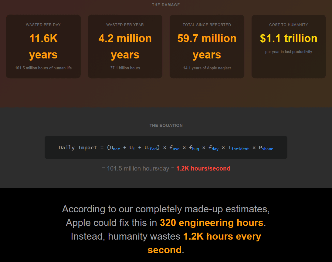 さらにスクロールするとメール検索の問題によって「1日当たり4200年分のユーザー時間が無駄になっている」「これまでに人類の4063億ドル(約63兆2600億円)が無駄になった」「Appleは320時間で問題を修正できるはずなのに、人類の時間が毎秒429.5時間も無駄になっている」といった数値が表示されました。