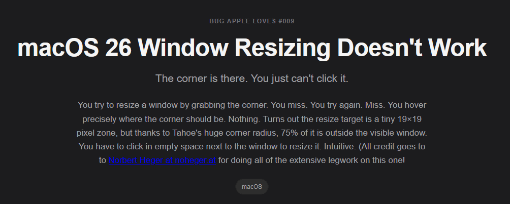 Bugs Apple Lovesには他の問題もラインナップされています。例えば、macOS 26(macOS Tahoe)で発生している「ウィンドウサイズの変更が難しい」という問題もありました。