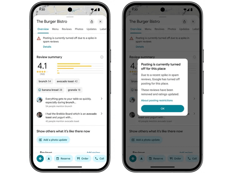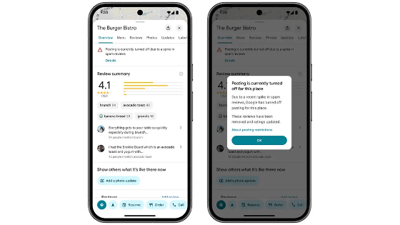 また、悪質なクチコミが急増した場合は新規クチコミの投稿を一時停止し、施設管理者に通知を送信します。さらに、施設情報の上部にクチコミ一時停止を示すバナーが表示されます。この保護機能は今後数週間以内に世界中で利用可能になる予定です。