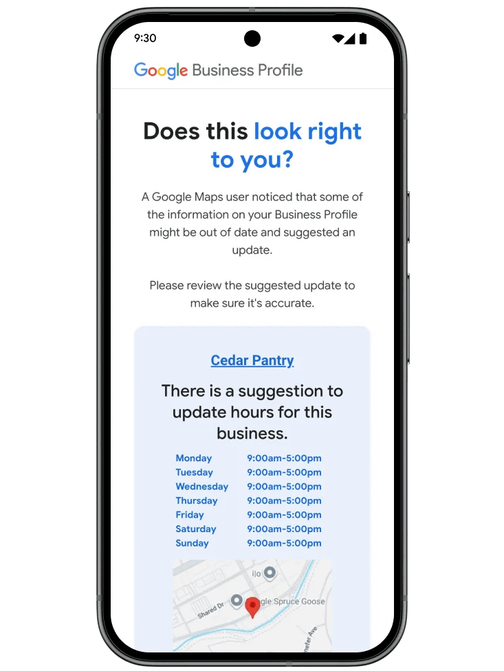 Googleマップでは店舗の営業時間や一時休業など、記載されている施設情報についても一般ユーザーが修正を提案できます。2026年4月からは営業時間に関する修正提案があった際に、適用前に施設管理者にメールで確認する機能が追加されました。メールは認証済みの施設管理者に対して送信されます。