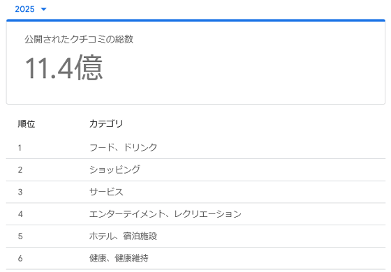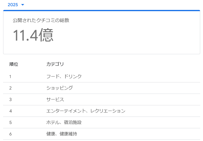 なお、Googleが公開したレポートによると、2025年に公開されたGoogleマップのクチコミ総数は11.4億件で、最もクチコミの多いカテゴリはフード・ドリンクだったそうです。