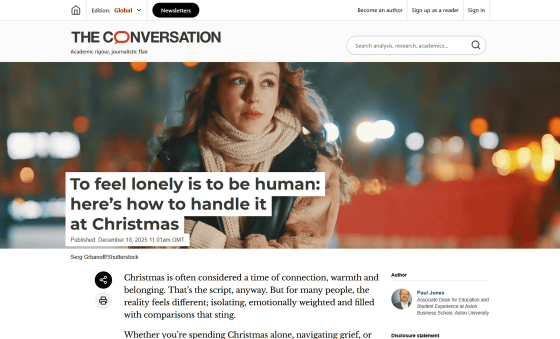 一般的に「クリスマス」といえば家族や恋人、大切な友人らと過ごすイベントだと見なされており、そんな時に誰とも会わずに1人で過ごしていると、孤独が重くのしかかってくるように感じます。イギリスのアストン大学アストンビジネススクールで教育および学生体験担当副学部長を務めるポール・ジョーンズ博士が、クリスマスに感じる孤独や対処法について解説しています。