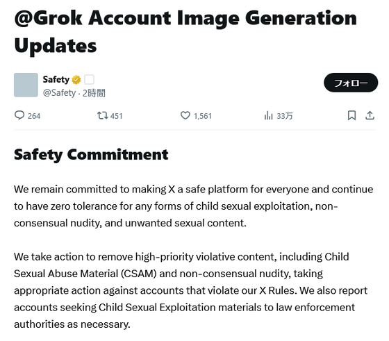 なお、Xでは以前から「投稿されるすべてのAIプロンプトと生成されたコンテンツは、Xのルールに厳密に準拠する必要がある」という方針を掲げており、今回の発表でも軸がブレていないことを主張しています。