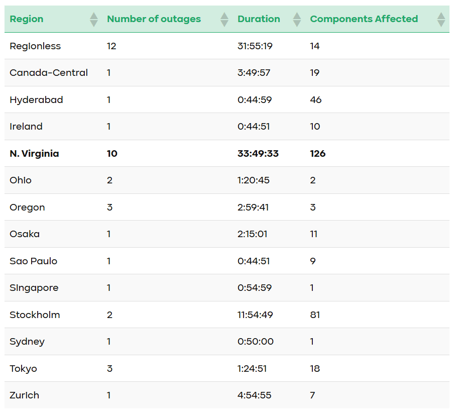 また、2025年は特定リージョンに帰属しない障害が例年より多かったとStatusGatorは分析しました。特定リージョンに帰属しない障害は全部で12件発生しており、累計停止は約32時間でした。これは単一リージョンの問題というより、複数リージョンにまたがる、あるいはグローバル性の強い障害が増えた可能性を示すものとして説明されています。