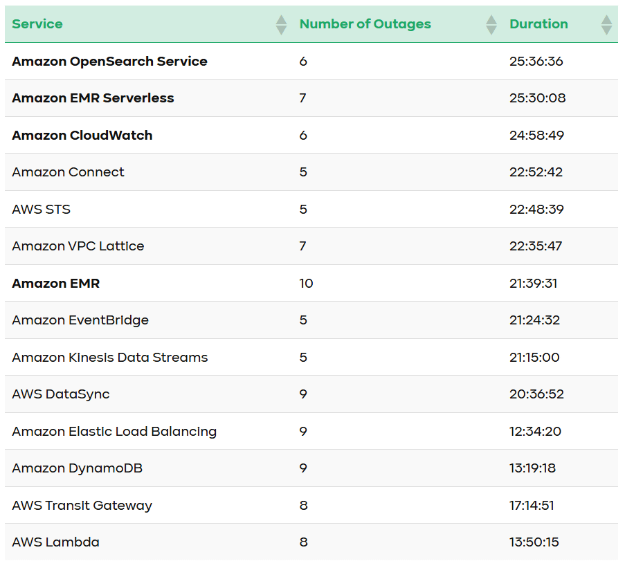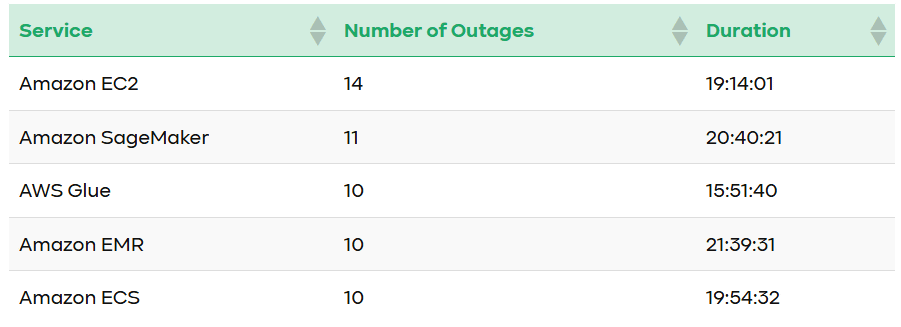 さらにリージョン単位だけでなく、サービス単位でも障害を整理すると、クラウドコンピューティング系・分析系・AIや機械学習系が目立ったとされています。障害件数が多いサービスとしては、Amazon EC2が14件で、Amazon SageMakerが11件、AWS Glueが10件、Amazon EMRが10件、Amazon ECSが10件と続きます。上位5サービスの中ではAmazon EMRの累計停止が21時間39分で最長でした。また、SageMakerは機械学習系サービスとしては想定以上に障害が多く、信頼性面での新しい傾向として注目されています。