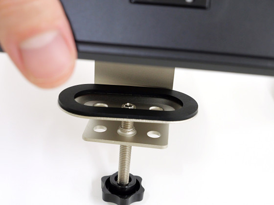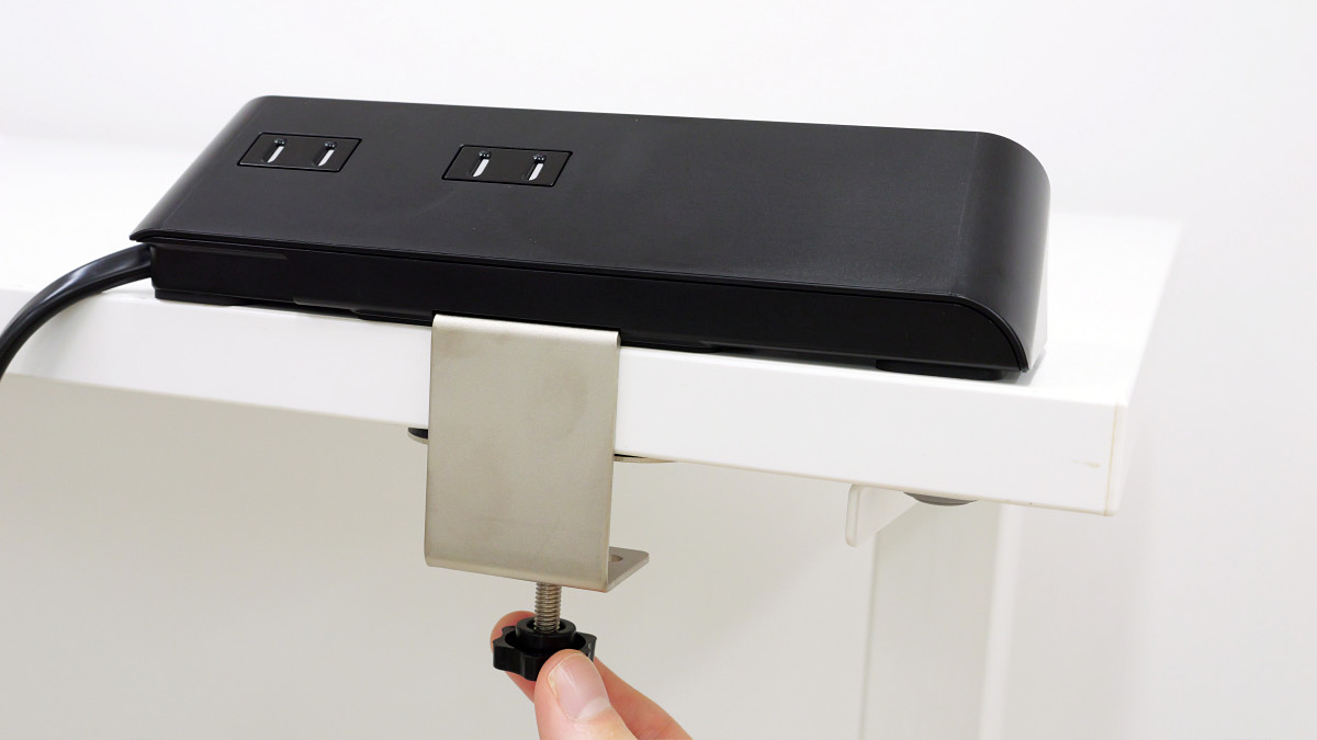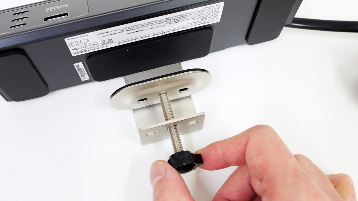 このクランプを使ってデスクの端っこに固定する仕組み。ノブは手で締められるようになっています。また、デスクに傷がつかないように電源タップの底面にパッドが貼られています。