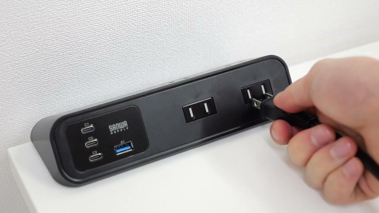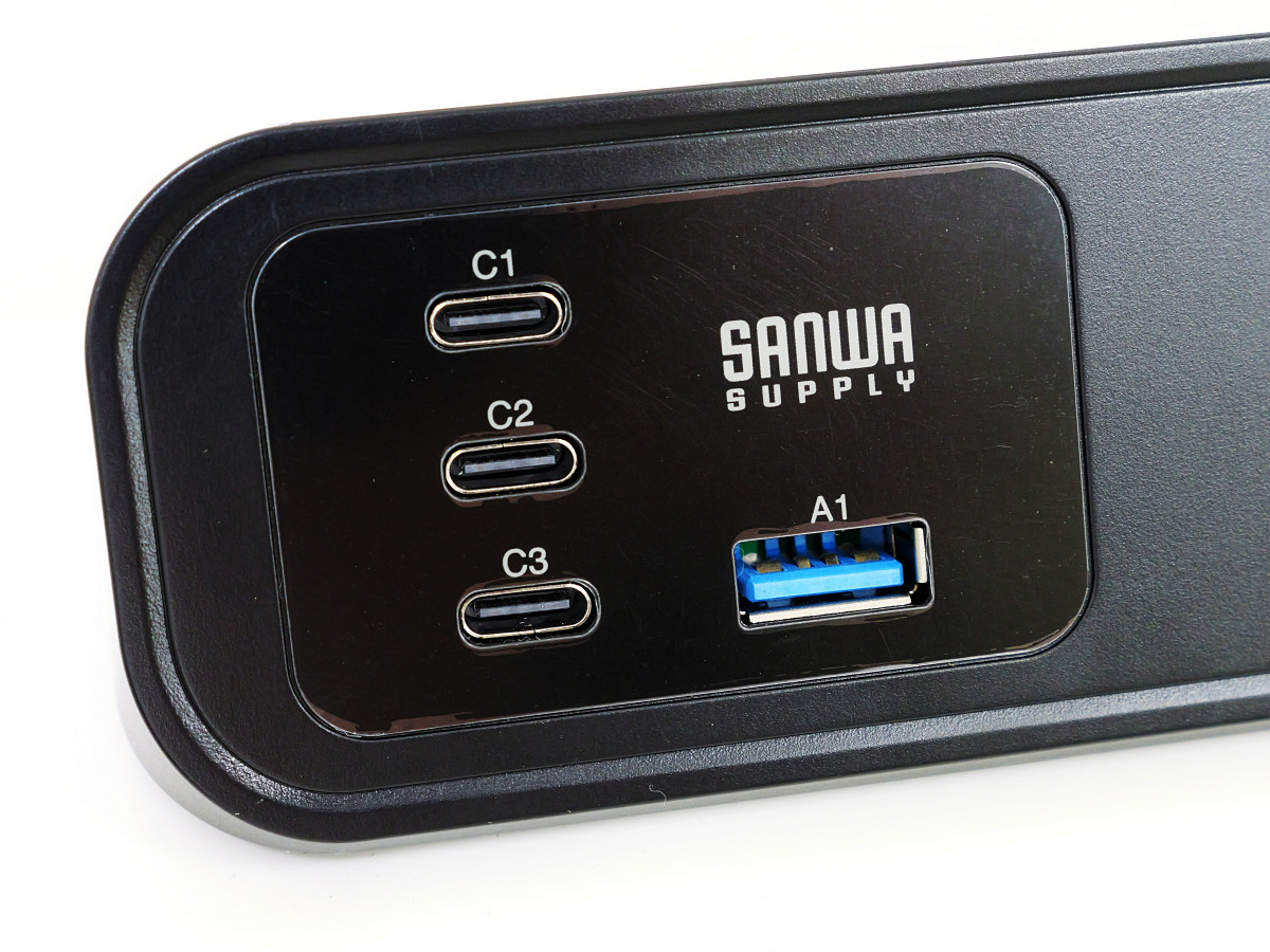 手前側にはUSB Type-Cポートが3個とコンセントが2個並んでいます。