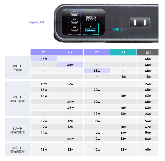 USBポートの出力はUSB Type-Cポートが最大65Wで、USB Type-Aポートが最大18Wです。