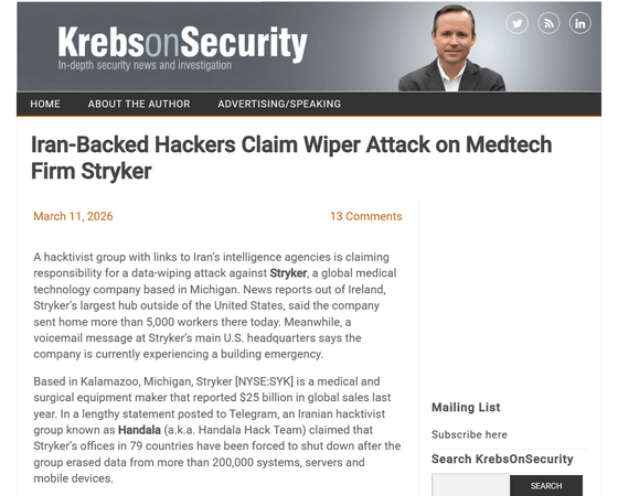 Strykerのウェブサイトによると、同社は世界の61カ国に5万6000人の従業員を抱えています。2026年3月11日にセキュリティアナリストのブライアン・クレブス氏がStryker本社に電話したところ、「現在、建物内で緊急事態が発生しています。後ほどもう一度お電話ください」という留守番電話メッセージが再生されたそうです。
