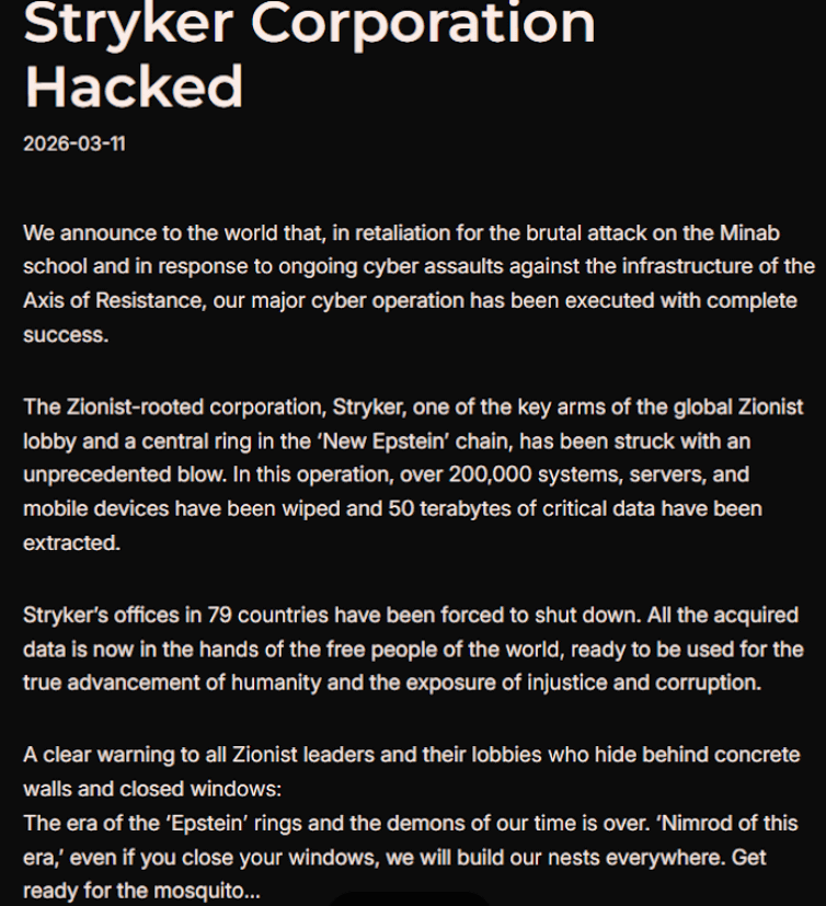 イランの諜報機関とつながりのあるハクティビスト集団が、アメリカ・ミシガン州に拠点を置く世界的な医療技術企業であるStrykerに対し、データ消去攻撃を仕掛けるという犯行声明を出しました。