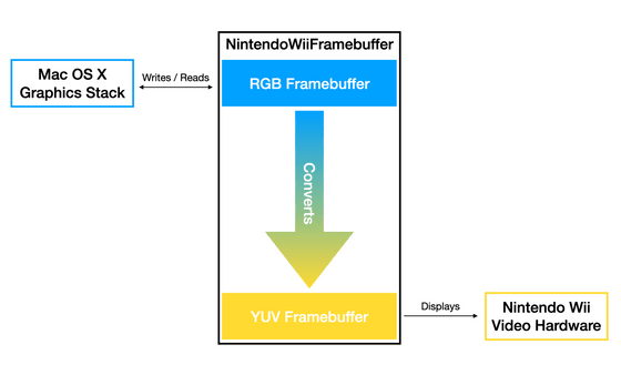 さらに、WiiのビデオエンコーダーハードウェアはアナログTV信号出力に最適化されており、フレームバッファに16ビットのYUVピクセルデータが必要です。しかしMac OS XはRGBピクセルデータを出力するため、2つのフレームバッファを使用して1秒間に60回の変換を行うようにしたとのこと。