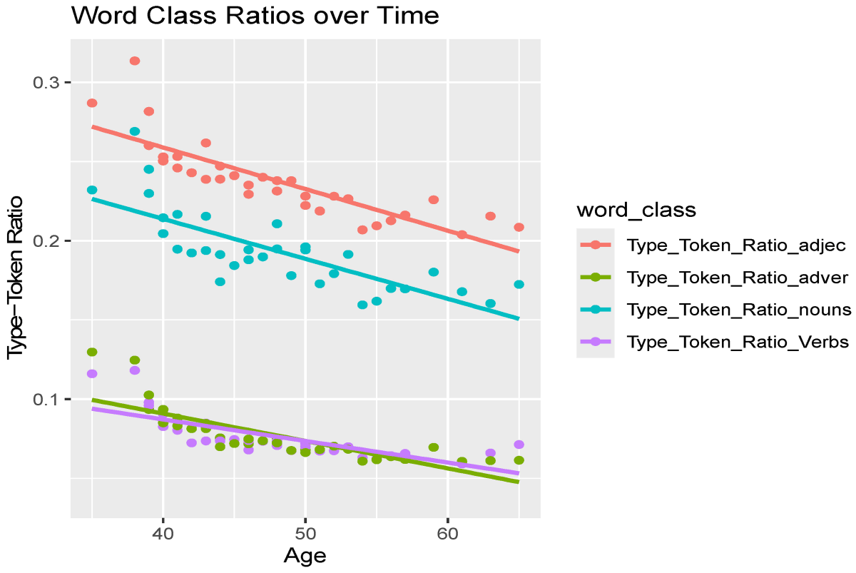 以下のグラフは、プラチェット氏の作品における語彙の多様性を示したもので、縦軸が語彙の多様性、横軸がプラチェット氏の年齢を表しています。それぞれの線は形容詞(赤色)・副詞(緑色)・名詞(青色)・動詞(紫色)を意味しており、形容詞と名詞の多様性が徐々に減少していることがわかります。