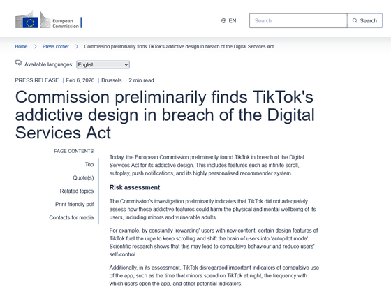 EUの行政機関である欧州委員会が、TikTokに組み込まれているアルゴリズムや無限スクロール、自動再生といった機能は青少年の精神的・身体的健康に悪影響を及ぼすもので、デジタルサービス法(DSA)違反の可能性があるという暫定的判断を下しました。