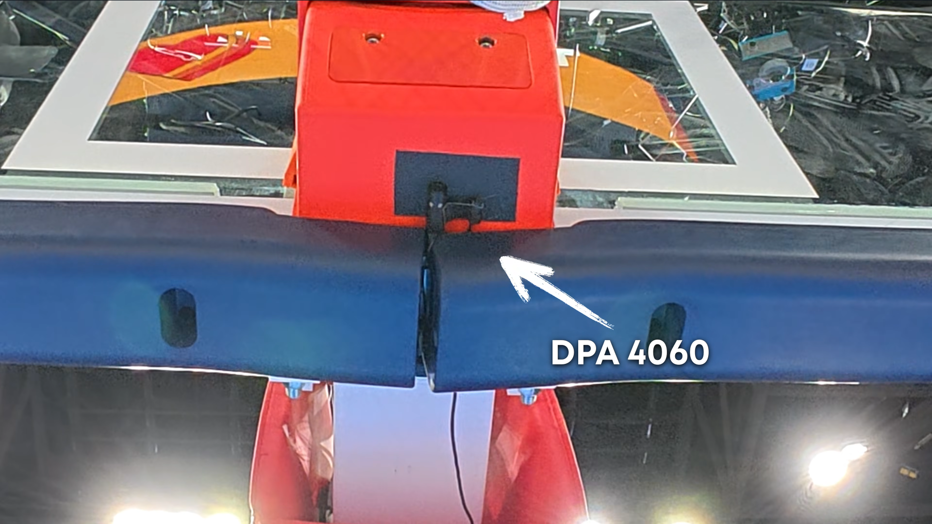 マイチャクザク氏が最初に示したのは、リング周辺に取り付けられたラベリアマイクです。これはシュートがネットを通過する「スウィッシュ」という音を拾うための重要なマイクで、DPAの「4060」が使われています。