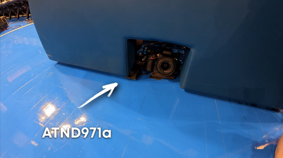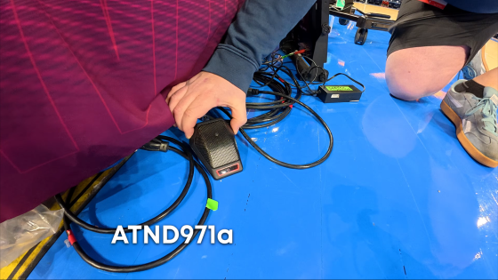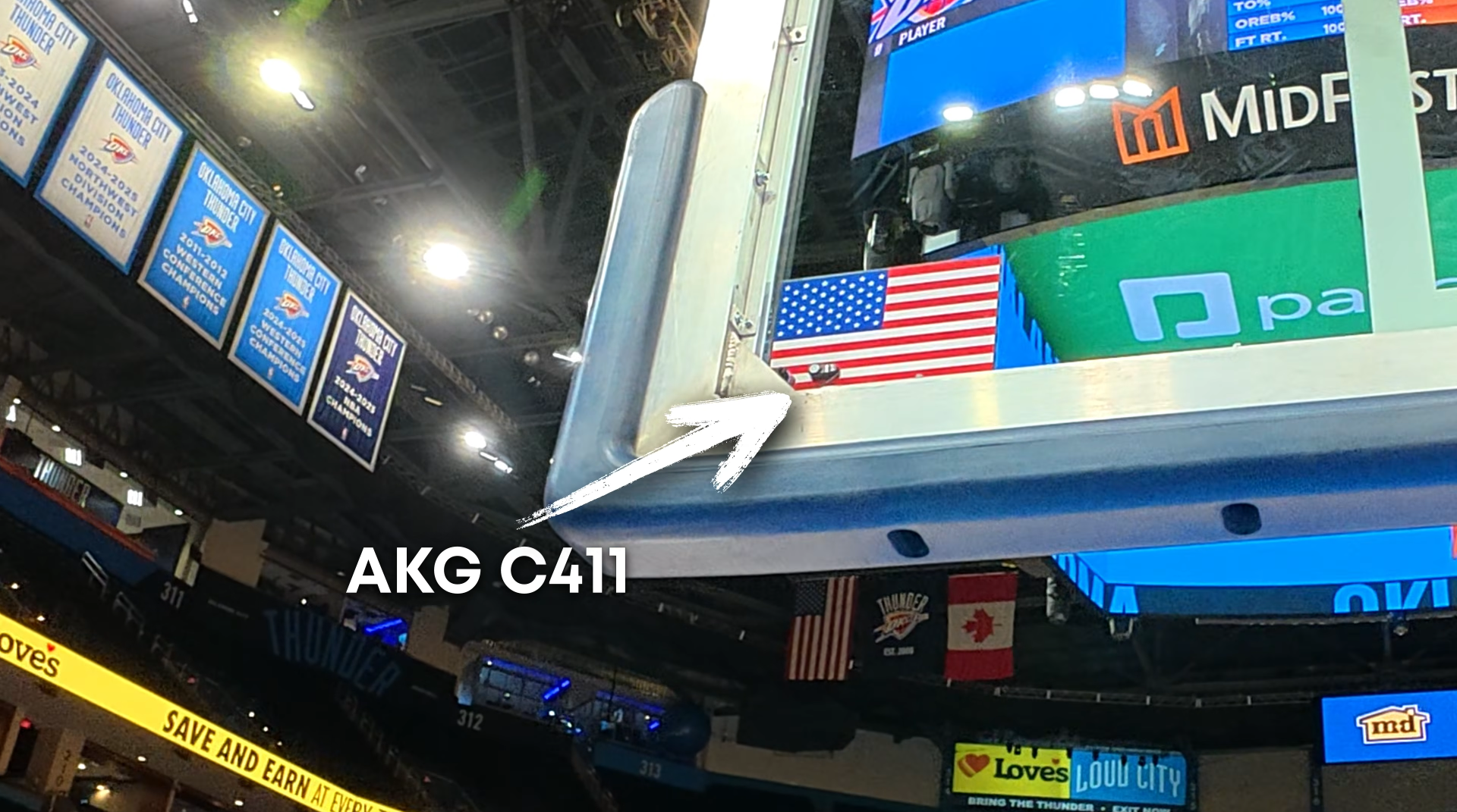 バックボードの裏側には、AKGのコンタクトマイク「C411」が設置されています。これは空気中の音よりも振動を拾うタイプのマイクで、ボールがバックボードに当たる「ドン」という音や、ダンクの衝撃、リムに当たった時の響きを収録するために使われます。
