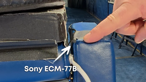 また、リングの正面下部にはオーディオテクニカの「ATND971a」も設置されています。これは床付近に置かれるタイプのマイクで、リング正面で起きるプレーの音を拾います。
