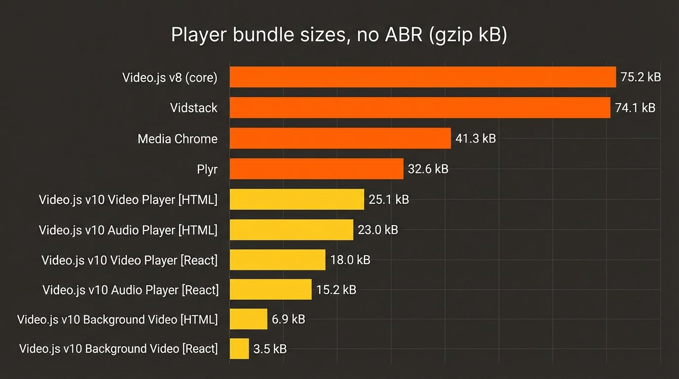 Video.js v10のファイルサイズ削減については必要なものだけでプレイヤーを構成できるよう設計されており、シンプルなユースケースではよりサイズを抑制することができます。例えばビデオプレイヤーと再生ボタンのみで構成されたReact用「hello world」プレイヤーはgzip圧縮するとわずか5KB未満です。