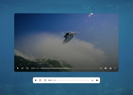 Video.js v10ベータ版にはすぐに使える完成度の高いスキン(コントロールセット)がいくつか含まれているものの、それで満足できない場合は任意のスキンに対して「Eject」という機能を実行すればフレームワークの言語に合わせた完全なソースコードを取得できると言及されています。ソースコードは実際に使用したり改変したりできる本物のコンポーネントであり、各コンポーネントは単一のHTMLを生成するためUI内で発生するすべてのイベントに直接アクセス可能です。