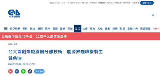 台大首創螺旋線圈分離技術 能源界咖啡機製生質柴油 | 生活 | 中央社CNA