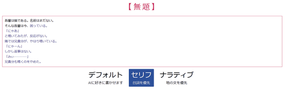 無題の下にあるテキストボックスにテキストを入力して、「デフォルト AIに好きに書かせます」「セリフ セリフを優先」「ナラティブ 地の文を優先」のいずれかを選んで、「続きの文を書く」をクリック。今回はページを開いた際に書いてあった「吾輩は猫である」の書き出しを利用し、「デフォルト AIに好きに書かせます」を選択しました。