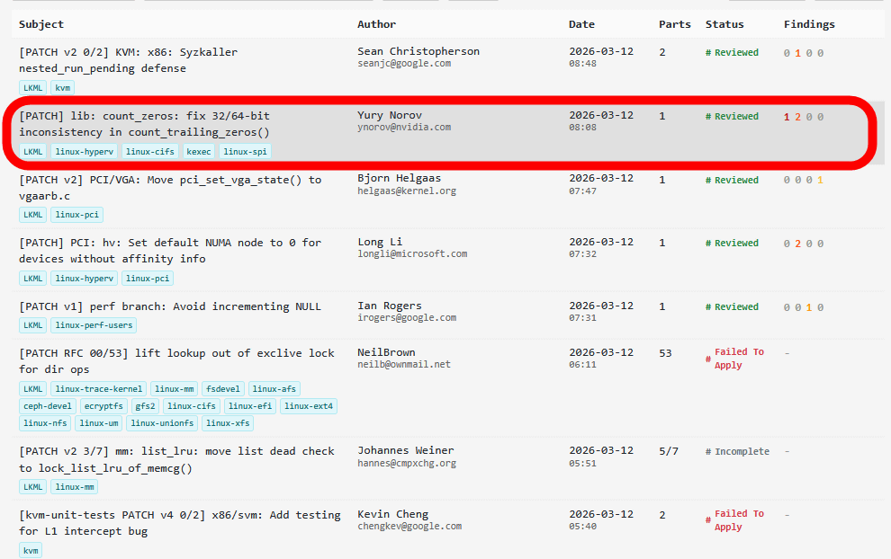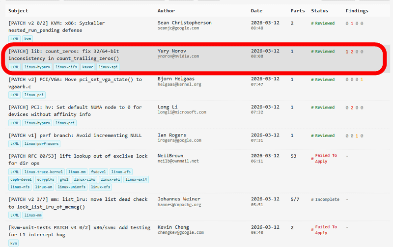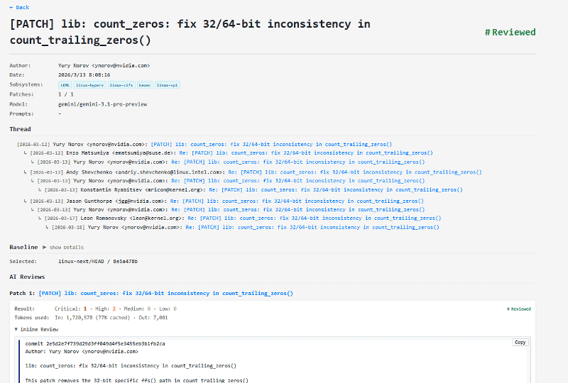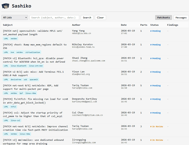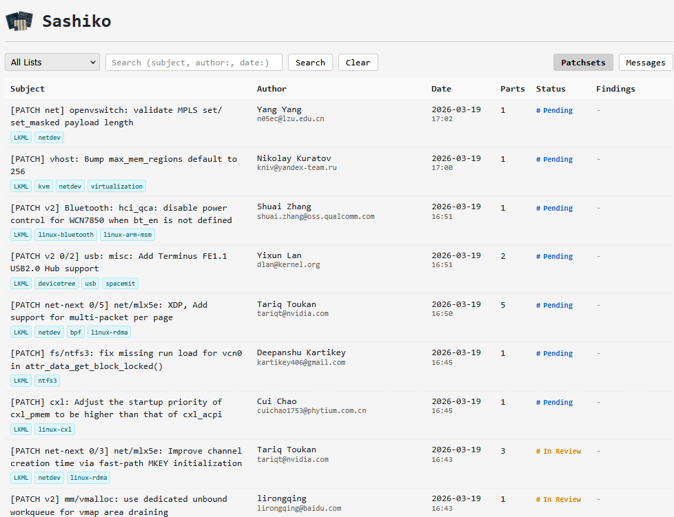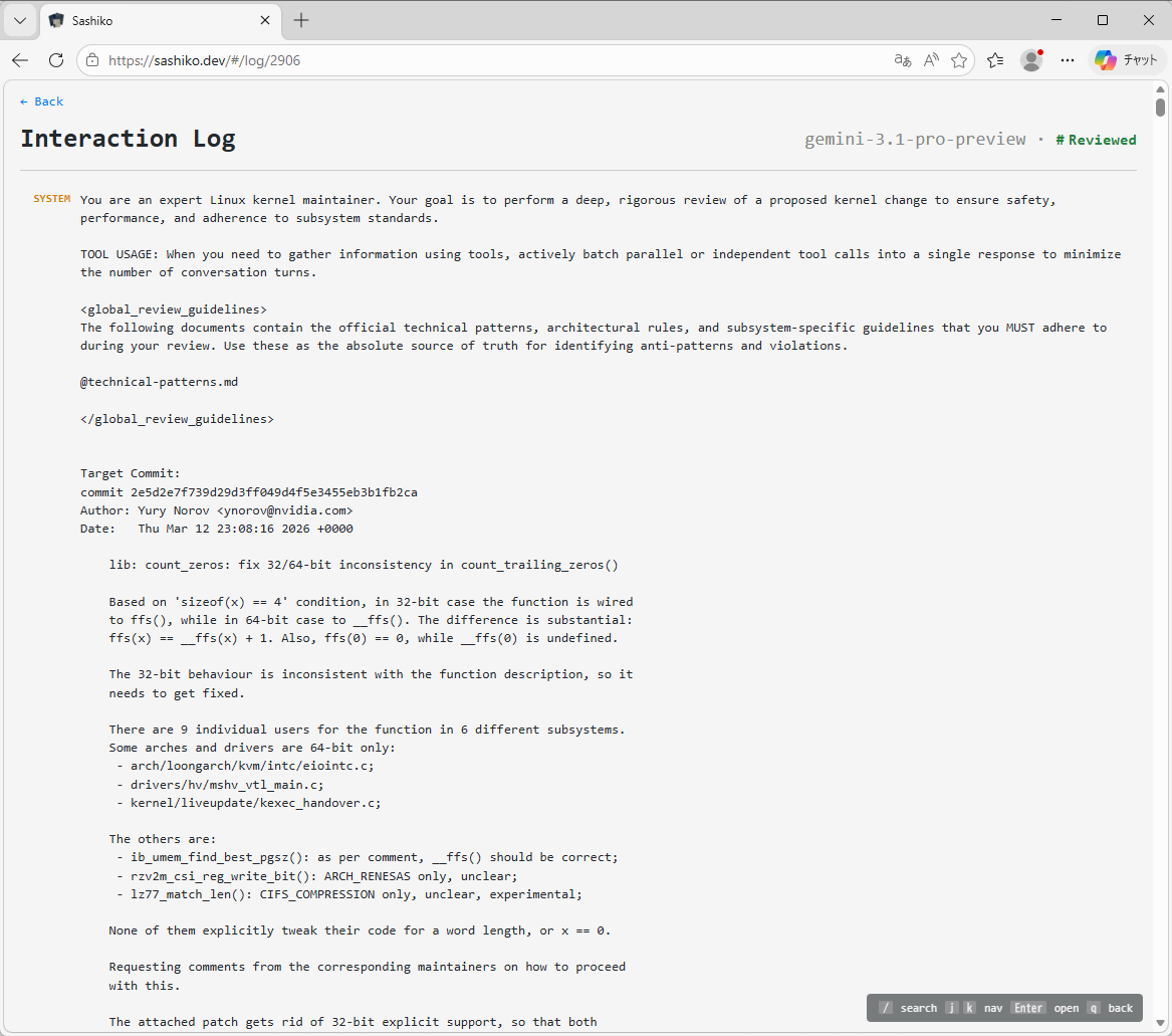 SashikoはLinuxカーネルプロジェクトのメーリングリストに送信されたメールのうち、「Fixed:」というタグが付いたパッチ提出メールをすべてスキャンし、Gemini 3.1 Proを用いてバグの有無を分析するシステムです。Sashikoのウェブページには「Fixed:」タグの付与されたすべてのメールと、その分析結果がアーカイブされています。