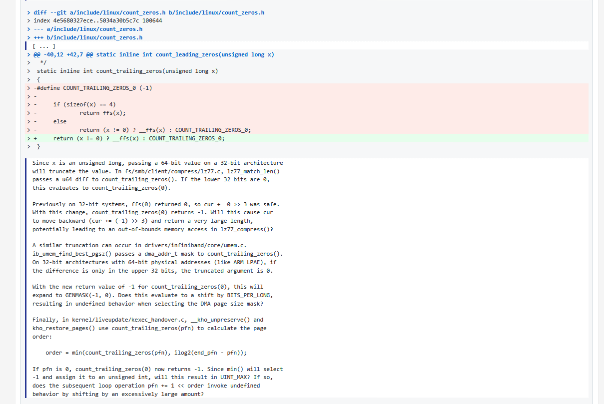 AIによるレビュー結果はパッチのコード内にインライン形式で表示されます。