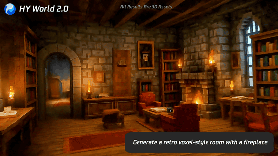 「Generate a retro voxel-style room with a fireplace」(暖炉を備えたレトロなボクセルスタイルの部屋を生成して)というプロンプトで生成された3Dワールドが以下。
