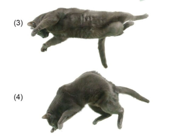 この結果について、グバー氏は「脊椎上部の柔軟性は、ネコがまず頭を正しい向きにするために回転するという認識を強く裏付けており、その生物学的構造がこれをできるだけ容易にするように調整されていることを示しています」と記しています。また、ハイスピードカメラで撮影した写真(3)は、前足は折りたたんだ状態で後ろ足の1本がピンと伸びており、これはまさに「タック&ターン」の典型的な状態です。
